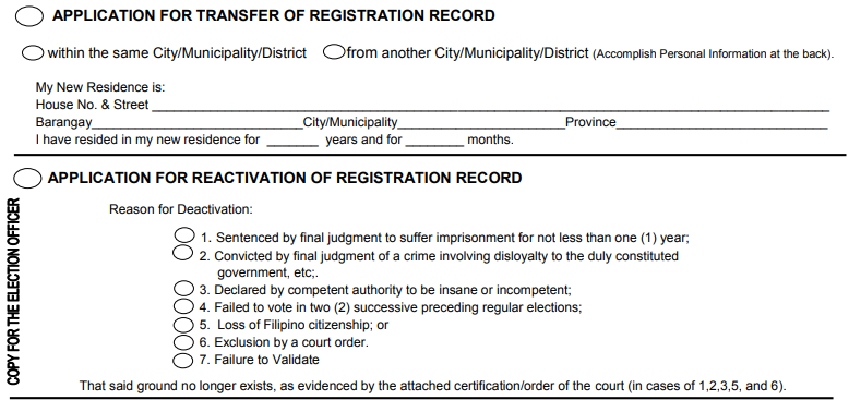The comelec requires filipinos to personally file their application for voter s registration at the office of the election officer or local comelec office in the city or municipality where they currently live. Comelec voter registration schedule. Here are a couple quick reminders on printing and filling out the forms. Also when filling out the comelec registration form select the application for transfer of registration record option.