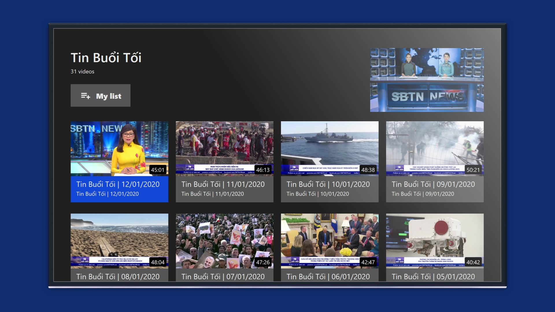 Sbtn online tv app. Saigon broadcasting televison network là hệ thống truyền hình việt nam đầu tiên phát hình 24 tiếng đồng hồ một ngày để phục vụ cho nhu cầu của khán giả việt nam tại hải ngoại. Sbtn rise gửi thiết bị bảo hộ y tế đến các bệnh viện sing for our heroes gây quỹ được 200 390 usd để mua thiết bị bảo hộ y tế chống dịch covid 19. With this subscription you will receive. Vod programs of sbtn news music sports talkshow gameshow documentary beautiful hd streaming videos automatically beam videos from your phone to your chromecast or airplay enabled devices pick up where you left off no problem comment on videos with the rest of the.