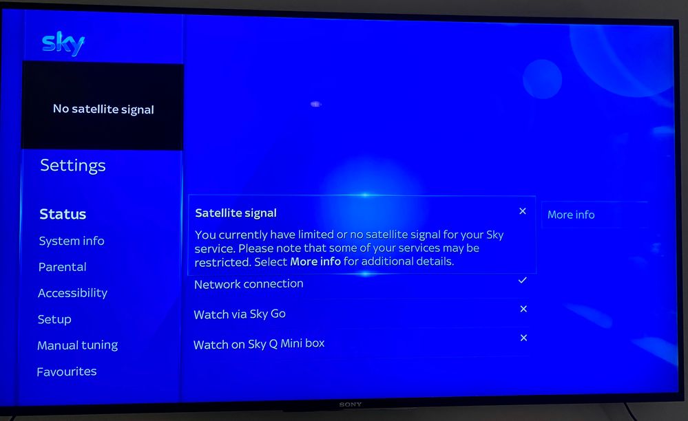 If it doesn t fix the satellite signal problem on your main box then try your sky q mini box again. Blue screen error messages that read your sky box isn t getting a satellite signal is often a sign of an exterior issue such as a damaged connection to your satellite dish. But is connected to our network fine with no network issues. A blue screen and unable to get into any sky programmes scrolling down to status screen comes up with signal unlocked signal strength 0.